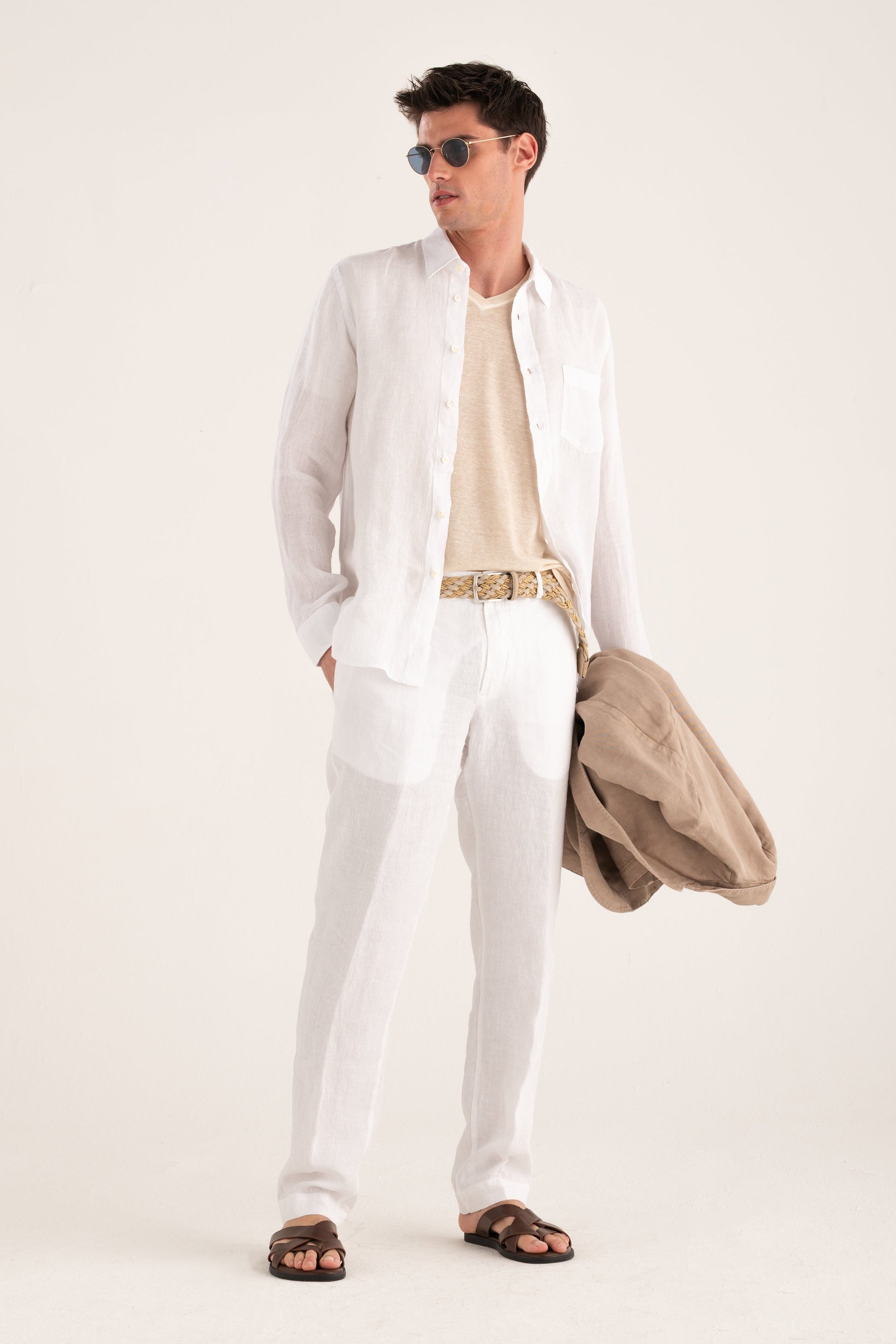 Combine com calça de linho branca ou alfaiataria clara para um visual sofisticado de verão. Para uma proposta mais urbana e elegante, use com chino neutra e loafers. Ideal para eventos diurnos, viagens, encontros e ocasiões onde elegância e naturalidade caminham juntas.