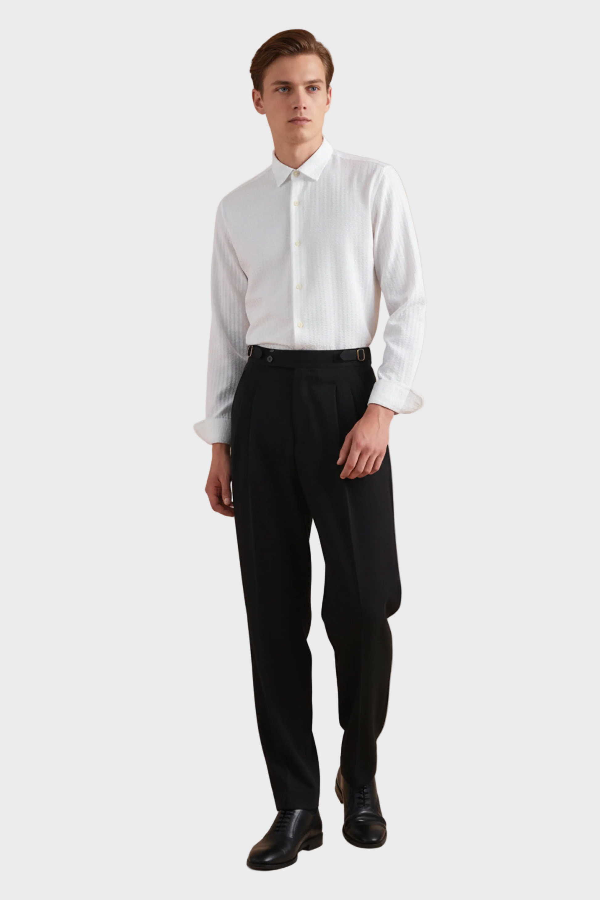 Combine com camisa minimalista ajustada ao corpo para destacar a cintura estruturada da peça. Para um visual mais estratégico e imponente, acrescente blazer de alfaiataria e sapatos em couro liso. Ideal para ambientes sofisticados, eventos formais ou ocasiões onde elegância e autoridade precisam caminhar juntas.