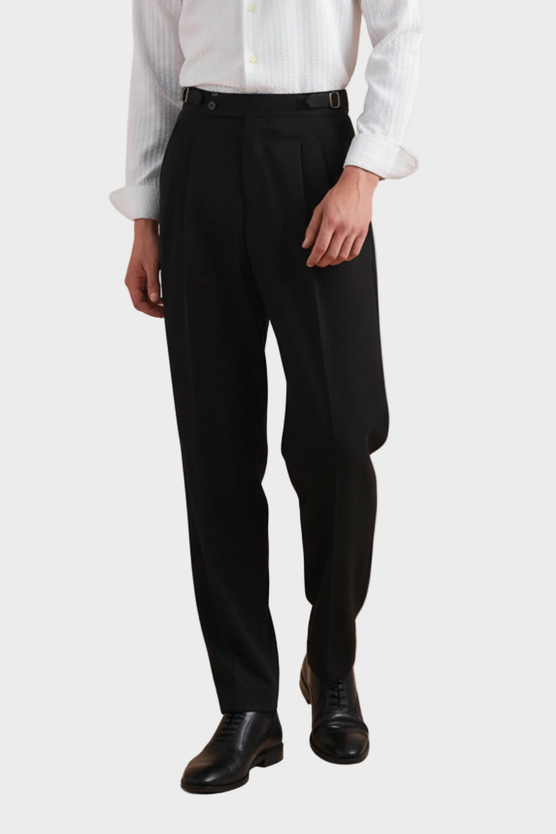 As pregas frontais acrescentam profundidade e fluidez ao caimento, enquanto o tecido encorpado mantém a estrutura elegante da peça. O resultado é uma silhueta imponente, alinhada e naturalmente sofisticada.